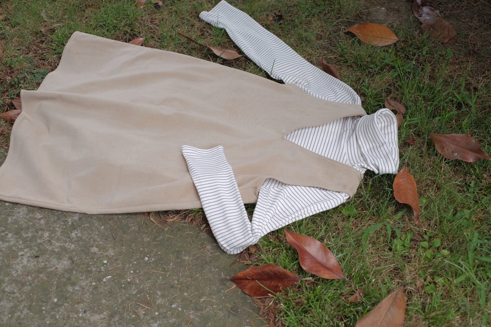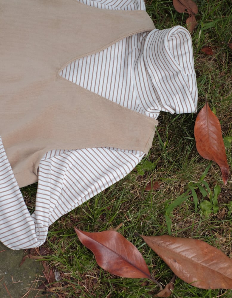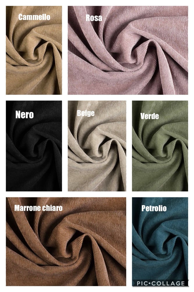 Taglio a trapezio, spalle libere,velluto a costine morbido che accompagna il movimento.
