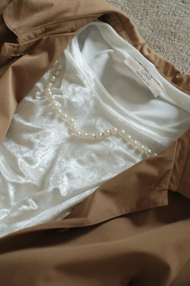 In velluto panné bianco perlato, scivola tra le dita con la morbidezza di un’onda e brilla come il coquillage di un’ostrica appena aperta.